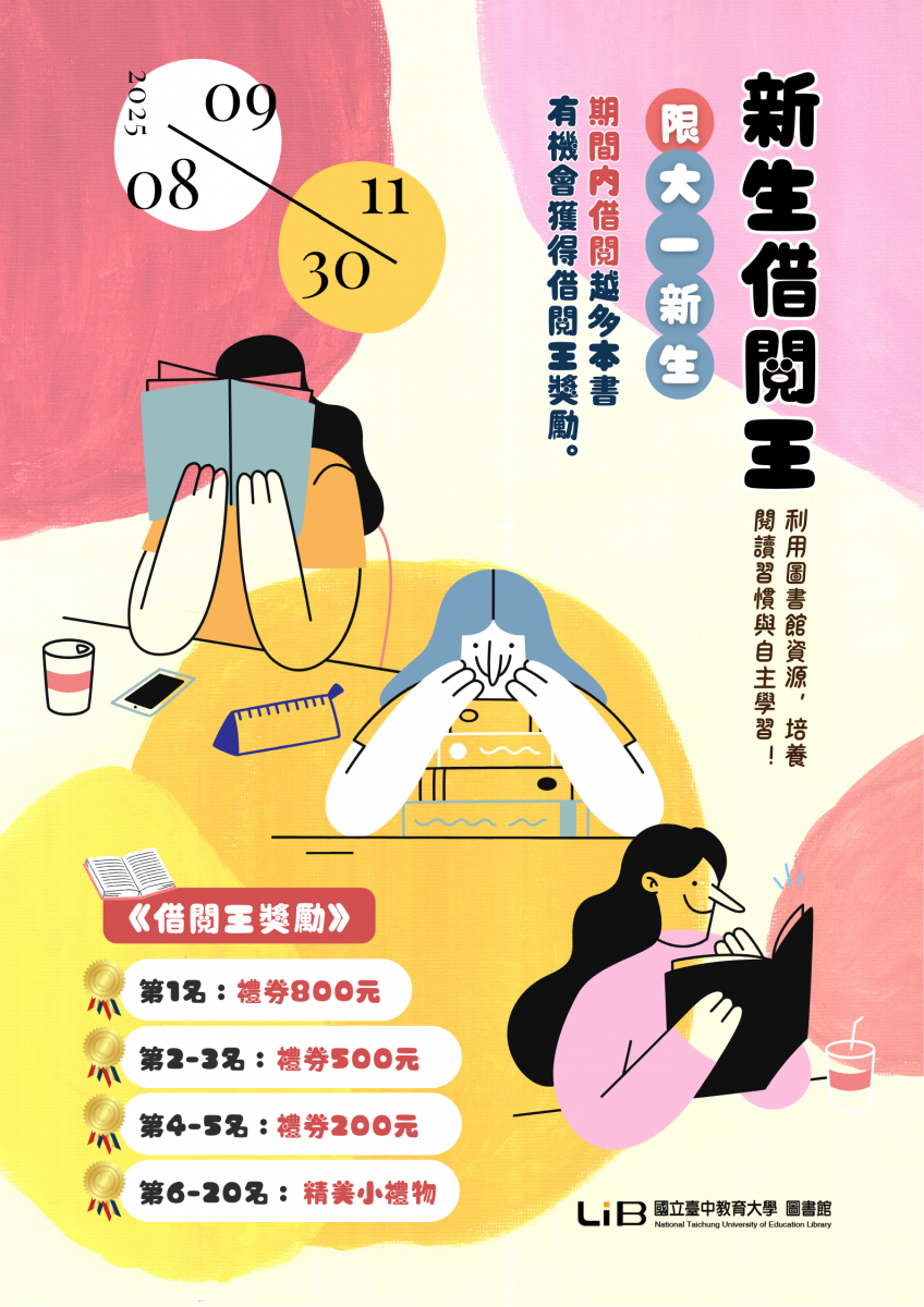 活動說明:新生借閱王活動,鼓勵大一新生踴躍借書,活動即日起至11月30日。
