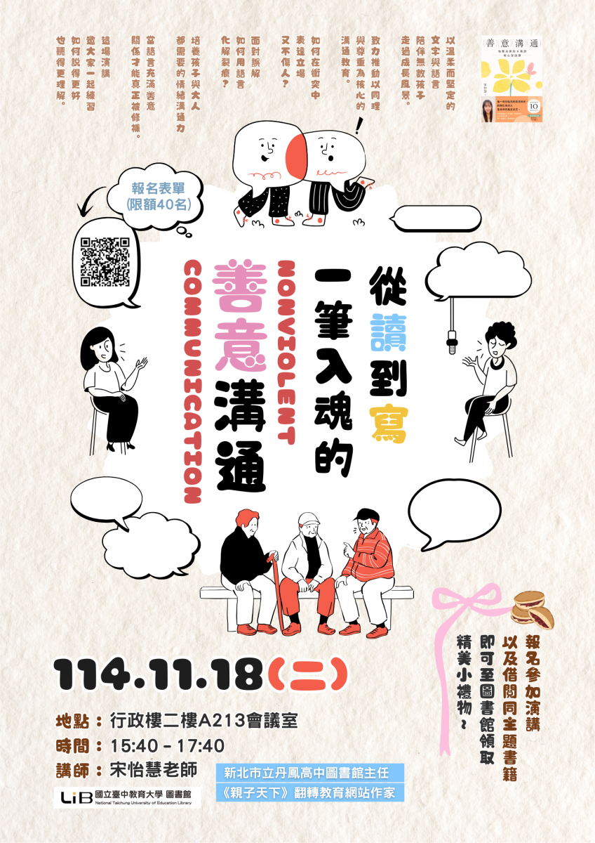 1.講題:從讀到寫:一筆入魂的善意溝通/丹鳳高中宋怡慧老師。線上報名(限額40名)