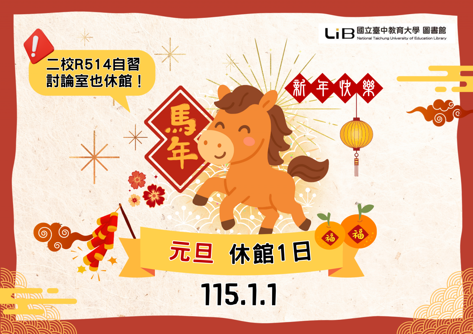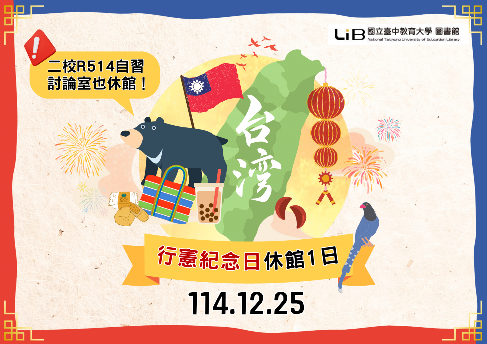 【休館公告】114.12.25(四)-行憲紀念日、115.01.01(四)-元旦