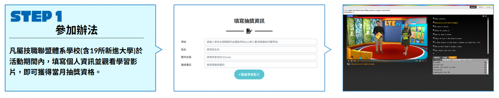 活動辦法:凡技職聯盟學校師生及教職員皆可參加,透過活動網頁 https://www.webenglish.tv/